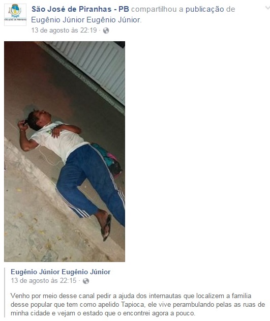 “Venho por meio desse canal pedir a ajuda dos internautas que localizem a família desse popular que tem como apelido Tapioca, ele vive perambulando pelas as ruas de minha cidade e vejam o estado que o encontrei agora a pouco”, escreveu Eugênio.