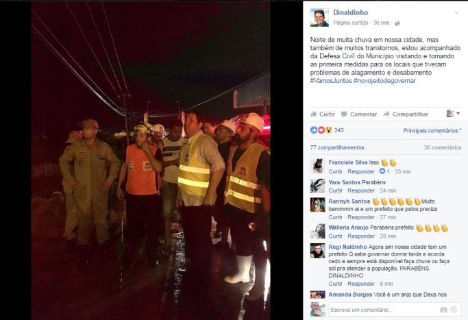 Nas redes sociais, o novo prefeito da cidade, Dinaldo Filho (PSDB) disse que acompanhará a Defesa Civil e vai fazer o que for necessário para apoiar à população atingida.