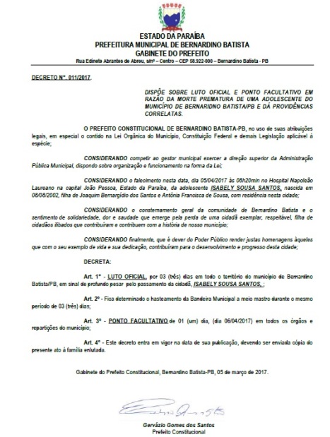 O prefeito Gervázio Gomes (PSB) decretou luto oficial por três dias e ponto facultativo para todos os órgãos municipais nessa quinta-feira.