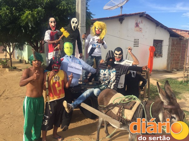 Em uma carroça, os caretas carregam o boneco que leva o nome do presidente, e nele está escrito: “Fora Temer”.