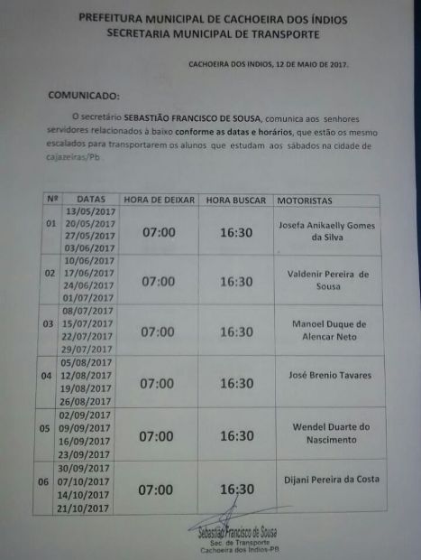 Um motorista da cidade de Cachoeira dos Índios, que transporta estudantes para faculdades de Cajazeiras denunciou nesta segunda-feira (15), que o secretário de transportes, Sebastião Francisco de Sousa, que é tio do prefeito Alan Seixas (PSB), está obrigando os profissionais a trabalharem aos sábados.