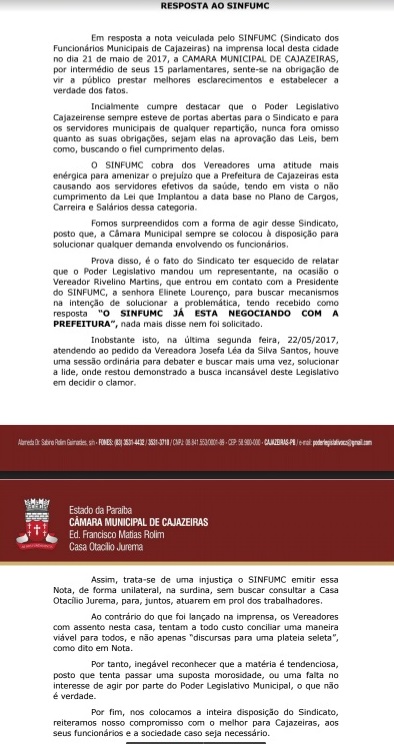 A Câmara de vereadores de Cajazeiras, através do seu presidente Marcos Barros (PSB), emitiu nesta quarta-feira (24), Nota à Imprensa, em resposta ao Sindicato dos Funcionários Municipais de Cajazeiras (SINFUMC).