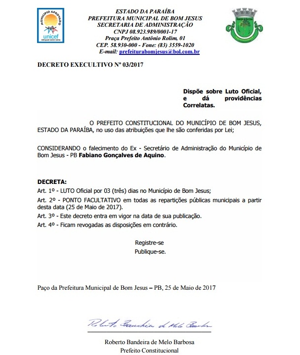 Roberto Bayma decretou luto oficial por três dias no município, além de ponto facultativo nessa quinta-feira (25).