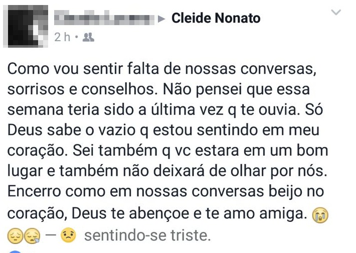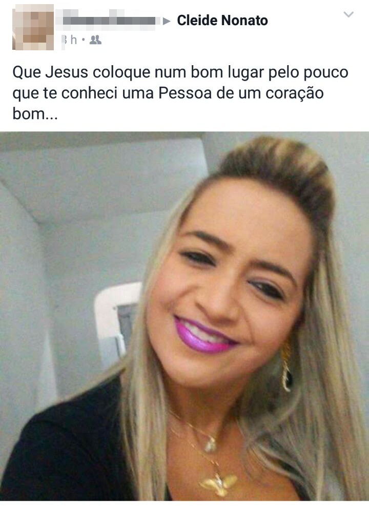 Amigos declaram tristeza nas redes sociais. Uma amiga de Cleide disse que ia “sentir saudades dos sorrisos e conselhos” da jovem.