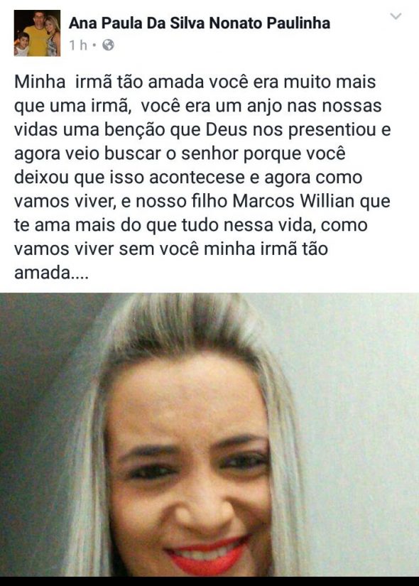 Já a irmã da secretária, Ana Paula Nonato disse amar a jovem e que ela “era um anjo na vida da família”. Ana Paula citou o filho e declarou que ele amava a tia mais que tudo.