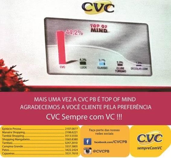 Mais informações na CVC localizada no Cajazeiras Shopping ou pelo telefone da CVC Cajazeiras: (83) 3531.7598/ 3531.7610.