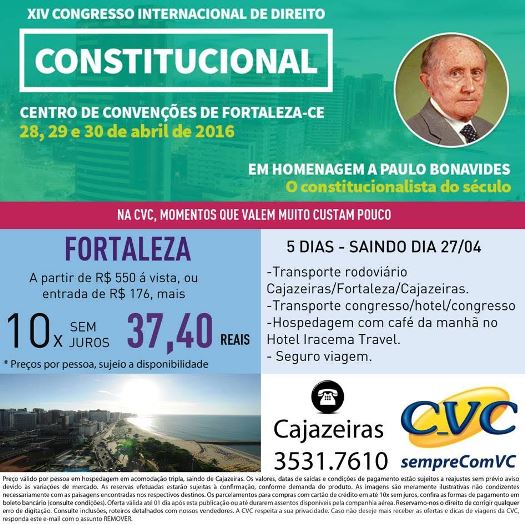 A CVC Cajazeiras anunciou nesta quarta-feira (30) uma super promoção de uma excursão para o XIV Congresso Internacional de Direito Constitucional em Fortaleza que acontece nos dias 28, 29 e 30 do mês de Abril de 2016 em homenagem ao constitucionalista do século, Paulo Bonavides.
