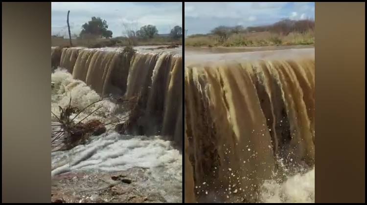 VÍDEO: Após forte chuva de 120 milímetros, açude transborda na região de Patos; sertanejos fazem ‘festa’