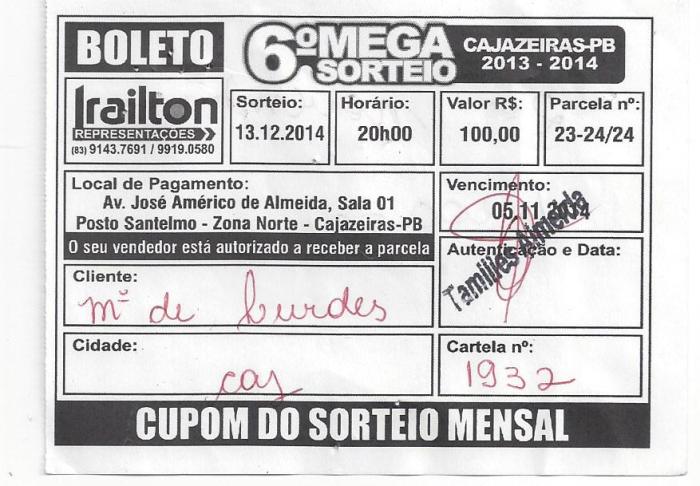 Maria de Lourdes (Representante Legal) de Cajazeiras ganhou R$ 1.200,00