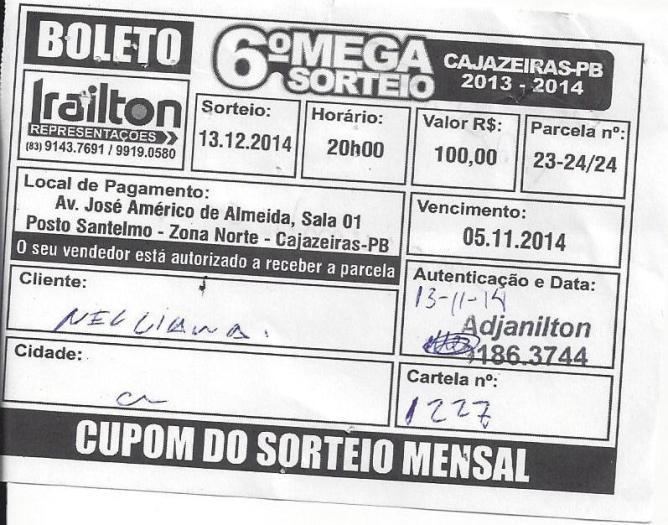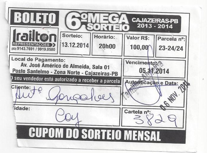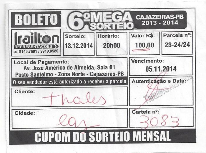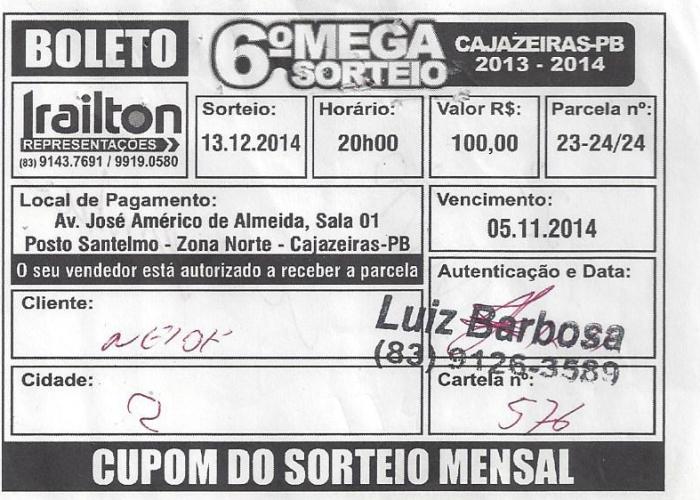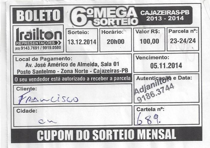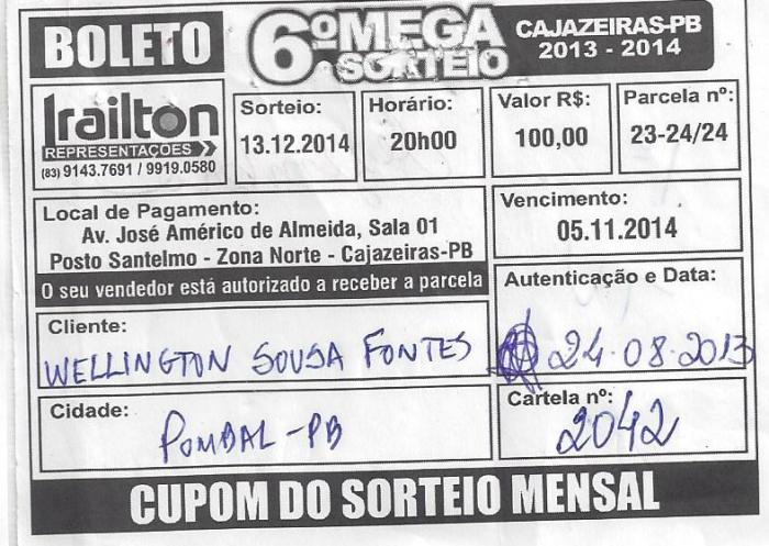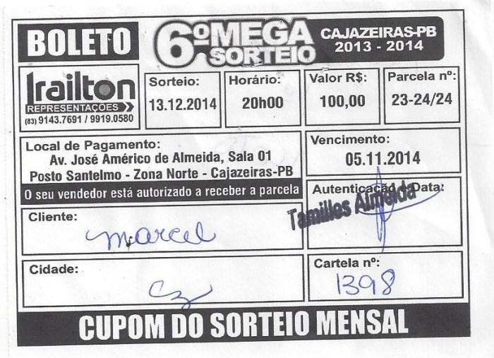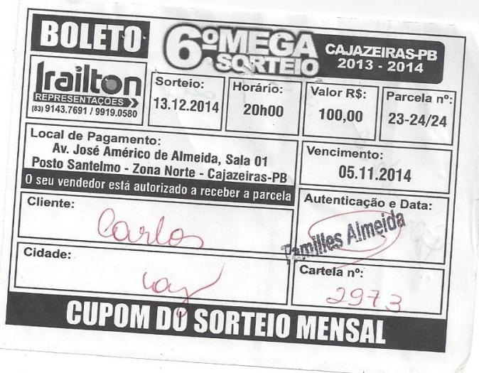 Carlos Marco (Rep. Legal) de Cajazeiras ganhou R$ 1.200,00