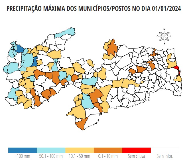 Os maiores índices foram nos municípios de Aparecida, onde choveu 109,0mm, e em Uiraúna, que registrou 108,2mm, ambos no Sertão do estado.