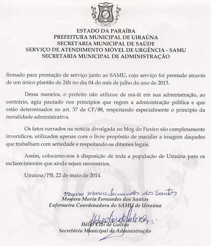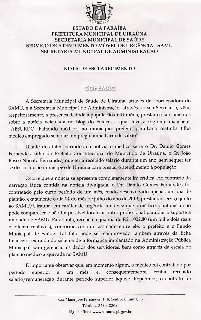 A Secretaria de Saúde e a Secretaria de Administração do município de Uiraúna enviaram uma nota de esclarecimento à imprensa e à população respondendo a denúncia do vereador Benevenuto Claudino (PSB), afirmando que o médico Danilo Gomes Fernandes, filho do prefeito Bosco Fernandes recebeu um ano de salário sem dar expediente.