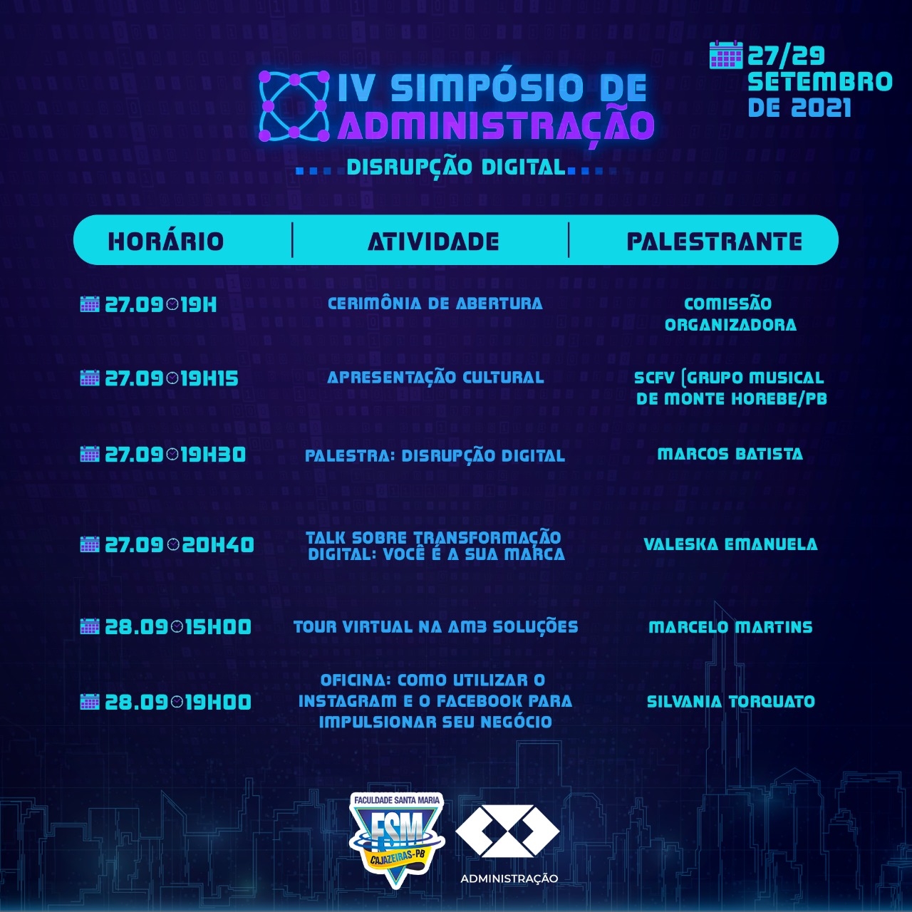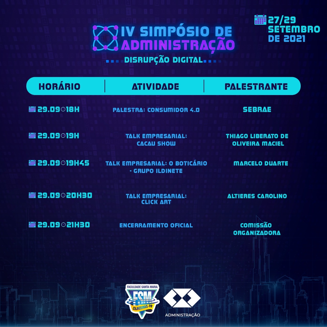 A Faculdade Santa Maria realizará de 27 a 29 de setembro o IV Simpósio de Administração com o tema: Disrupção Digital.
