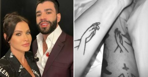 a modelo postou uma foto em que segura a mão do sertanejo e na qual aparece uma tatuagem idêntica dos dois com a mesma pose