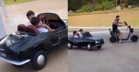 Filhos de Gusttavo Lima ganham carros motorizados de brinquedo