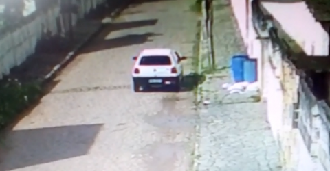 O animal foi levado por uma moradora para sua residência. O homem que aparece no vídeo não foi identificado.