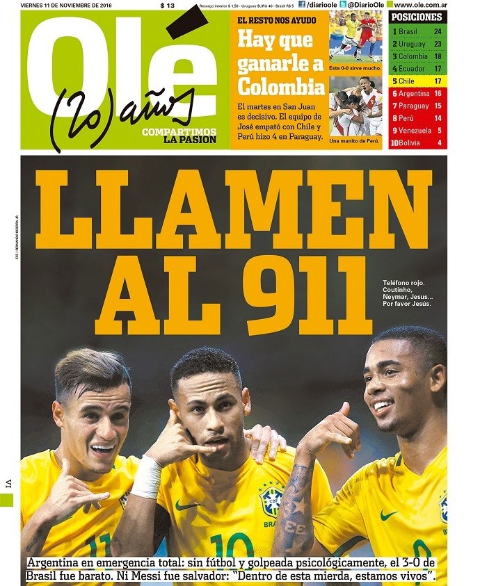 Em sua capa, "Olé" usa tom alarmista e chama atenção para situação hermana nas eliminatórias para a Copa do Mundo: "Sem futebol e abalada psicologicamente"
