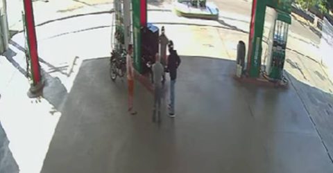 O homem chega numa moto e para ao lado de uma das bombas de combustíveis e com arma em punho ameaça os trabalhadores