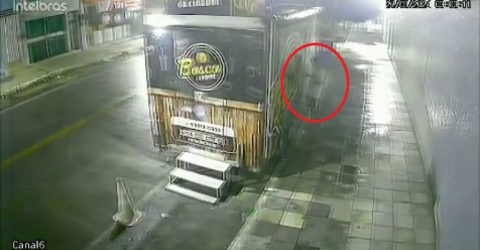 As imagens mostram que o suspeito passa caminhando pela calçada da farmácia, localizada na Avenida Engenheiro Carlos Pires de Sá, e instantes depois ele retorna, entra e anuncia o assalto