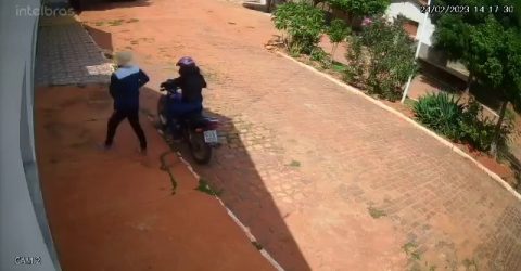Uma câmera de segurança do lado de fora registrou o momento em que os bandidos chegaram de moto na palhoça,, pularam a janela e renderam os clientes