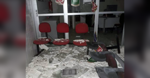 De acordo com a polícia, um bando formado por pelo menos quatro indivíduos estourou caixas eletrônicos e quebrou paredes para alcançar o cofre da agência