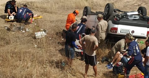 Motorista do veículo perdeu o controle, desceu uma ribanceira e capotou. Todos foram socorridos com vida.