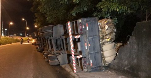 O motorista informou à reportagem que a carga que ele levava - de papelão - pendeu, e ele não conseguiu segurar o veículo.