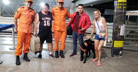 Subtenente J. Maria e o cão Uno e o soldado Gomes com a cadela Anny embarcaram para Minas Gerais na última sexta-feira (2).
