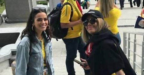 Ela tirou foto com um fã e foi fotografada por outro ao chegar ao estádio.