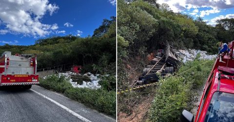 Caminhão carregado de ração falta freio, capota na Serra de Teixeira e motorista fica preso nas ferragens