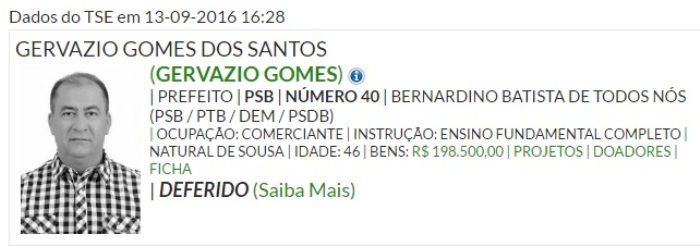 Foi deferida pela Justiça eleitoral a candidatura de Gervazio Gomes do Santos (PSB) e o vice Francisco de Assis Gomes – Assissinho (PTB)