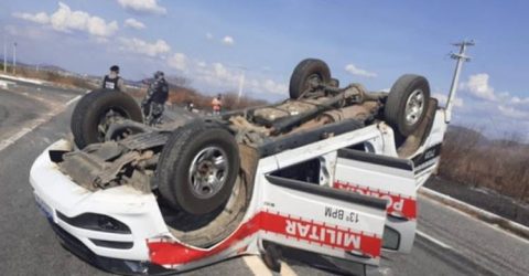 Após o capotamento, a viatura (VTR) policial ficou com os pneus pra cima e com os vidros dianteiros totalmente destruídos
