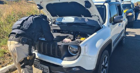 O carro foi apreendido e após consulta foi verificado que se trata de um veículo roubado e com placa clonada. Os meliantes foragiram por dentro de um matagal