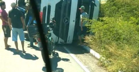 De acordo com informações da Polícia Militar, o motorista perdeu o controle de uma carreta na curva da rodovia e tombou.