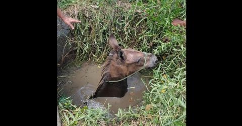O animal ficou com a cabeça fora d'água e conforme os bombeiros, o local era de difícil acesso, e por o diâmetro ser pequeno, dificultou mais ainda o resgate