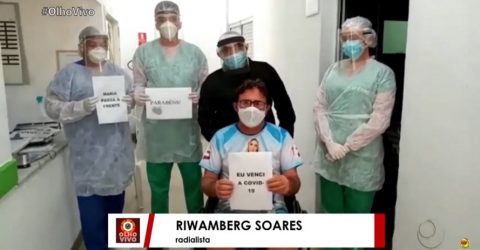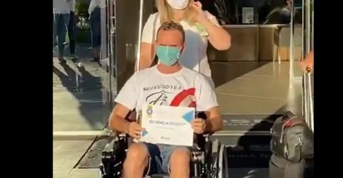 o prefeito ainda na cadeira de rodas conseguiu levantar a plaquinha com a frase: "Eu venci a COVID-19"