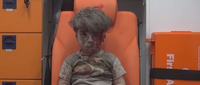 O menino tem cinco anos e aparece ensanguentado e em choque depois de um ataque aéreo ao bairro onde ele morava