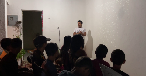 Desenvolvendo um trabalho junto À Casa Cultural, o mestre dá oficinas para crianças da comunidade onde ensina a brincadeira popular