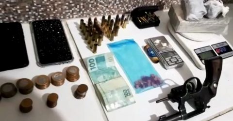 Conforme relato policial, com o investigado foi apreendida certa quantidade de entorpecentes. Além dos mandados, o indivíduo foi autuado em flagrante por causa da droga encontrada com ele