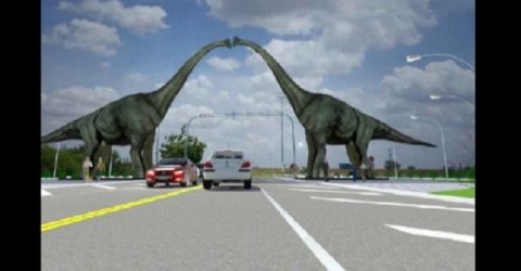 A obra que começou em 2018 contém duas réplicas gigantes de dinossauro, aparentemente da espécie brontossauro, conhecida pelo pescoço longo, feitas pelo artista plástico Berg Carnaubano