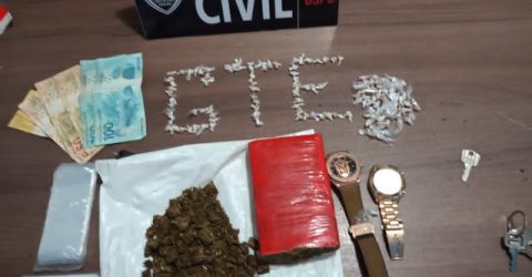 Na ação foram apreendidas várias predas de crack, quase um quilo de maconha, uma quantia em dinheiro, além de sacos plásticos que seria usados para embalar a droga.