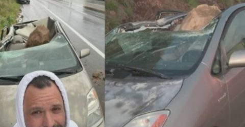 Uma imensa rocha havia rolado da encosta e caído exatamente sobre o teto do sedã de Mauricio