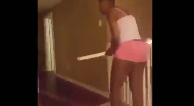 A mãe aparece com um pedaço de madeira na mão batendo em sua filha de 16 anos