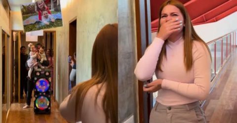 A surpresa, compartilhada pela ex-BBB nas redes sociais, incluiu um cenário decorado com fotos da família e mensagens de carinho
