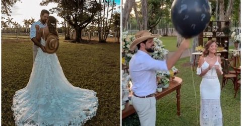 O casal aproveitou a festa de casamento para revelar o sexo do 1º filho.