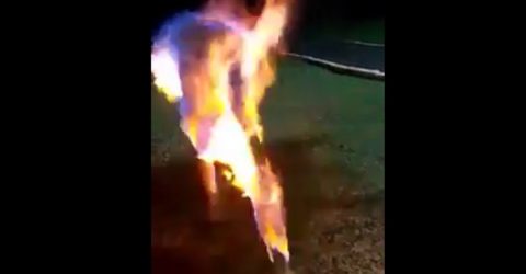 Tudo foi registrado em vídeo. Ao atear fogo, ele dispara em direção às águas de um lago com o corpo totalmente em chamas