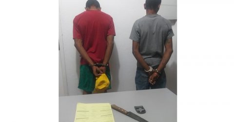 Com os suspeitos os policiais apreenderam uma faca peixeira de 7 polegadas.