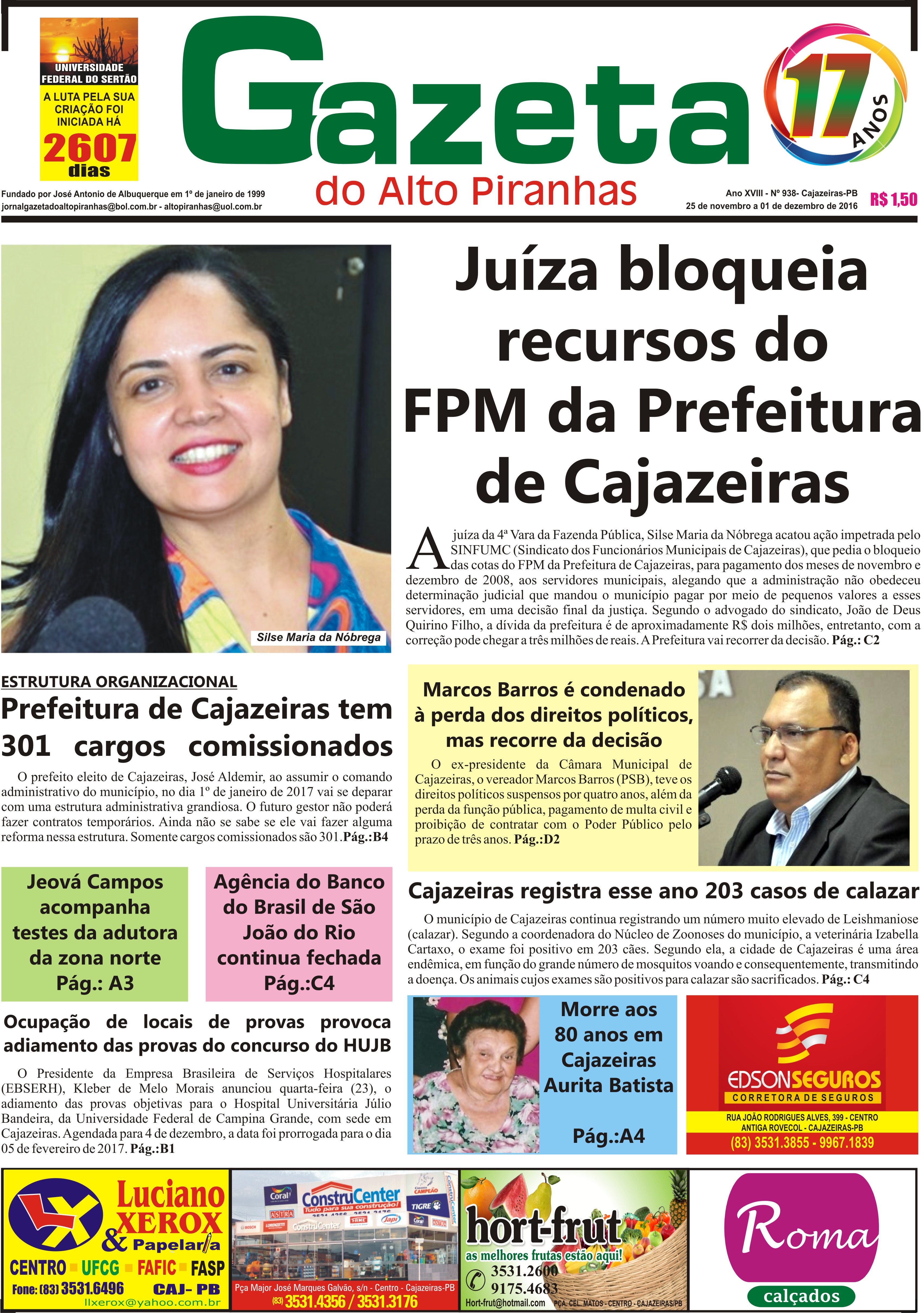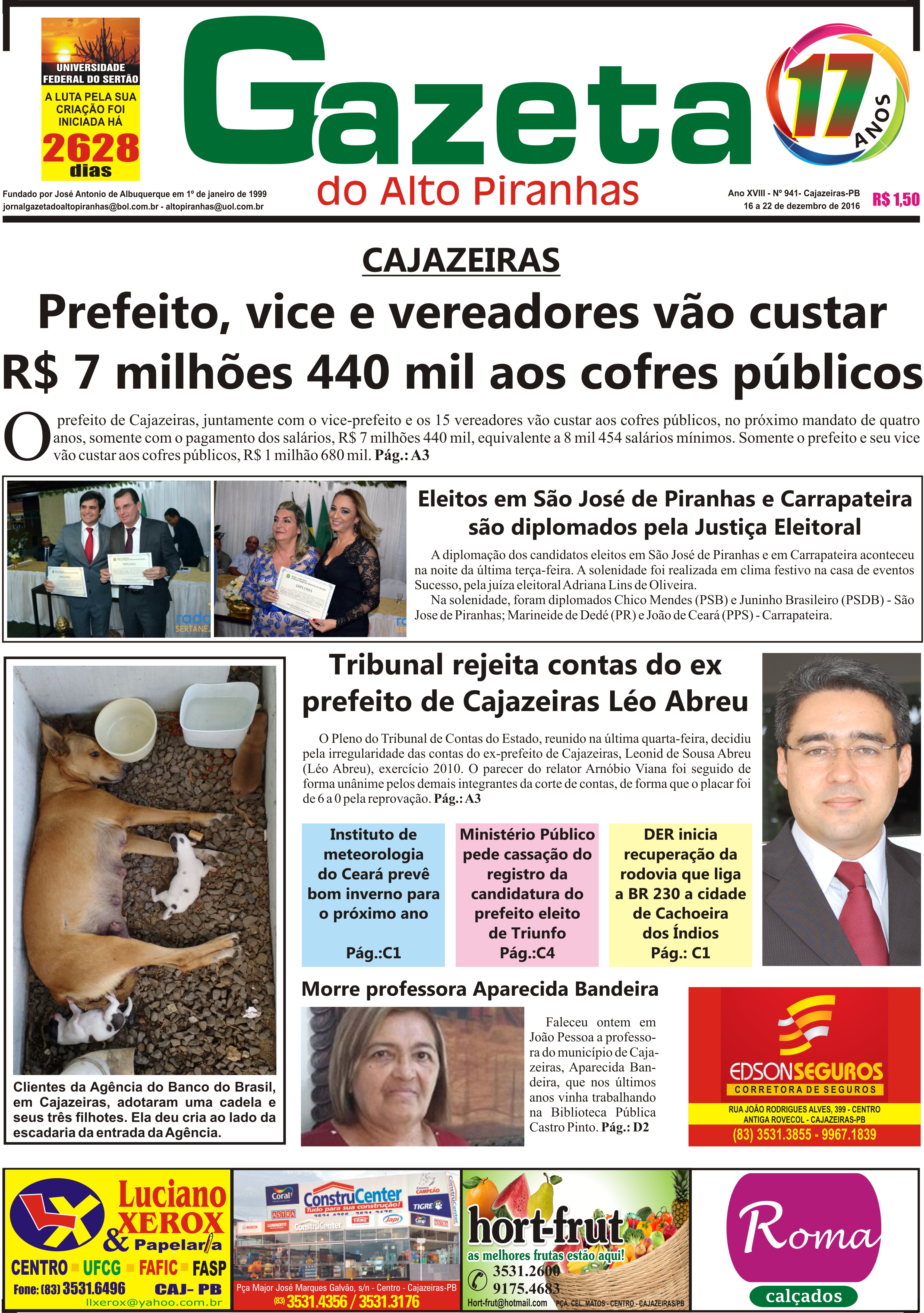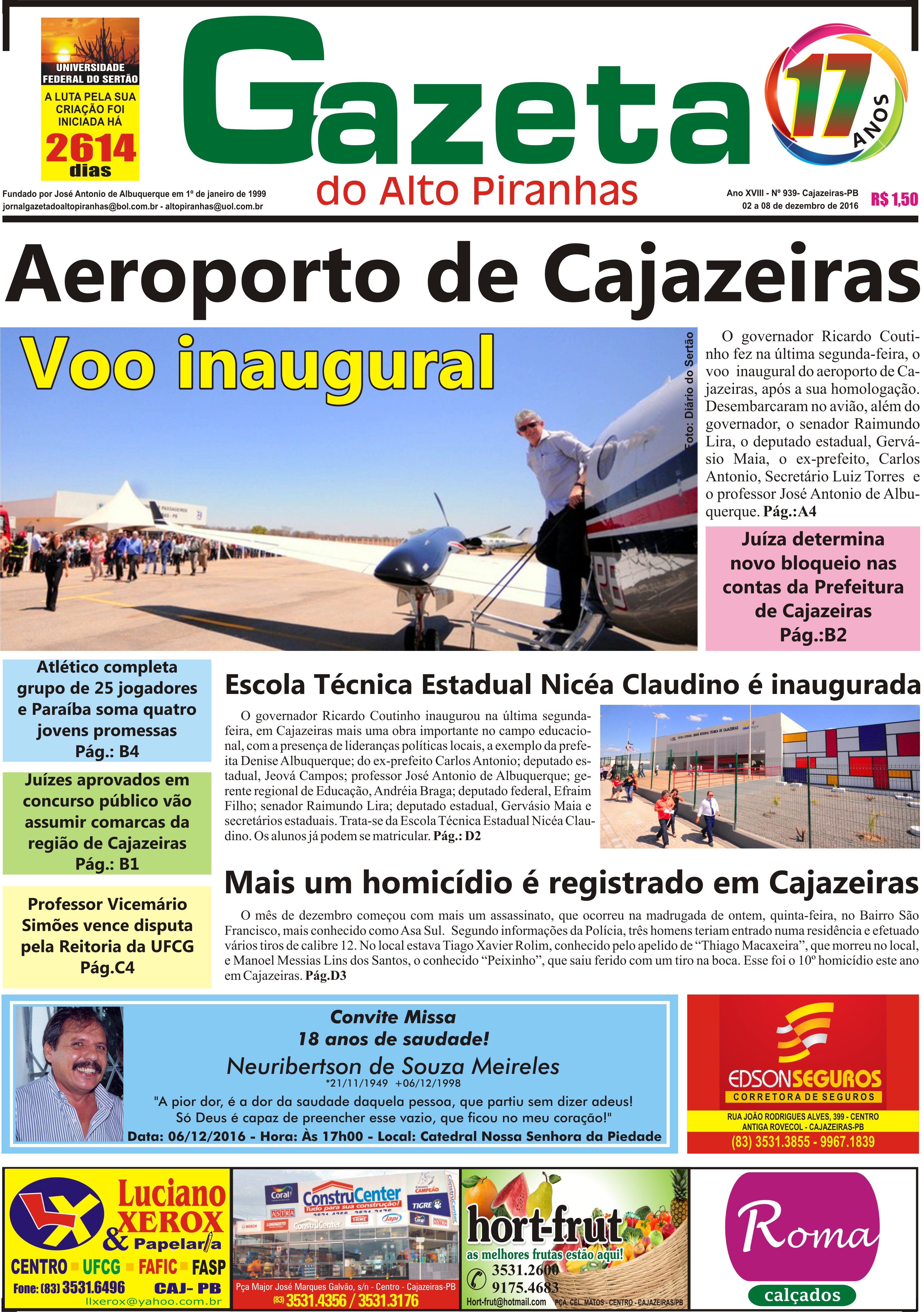 Jornal Gazeta do Alto Piranhas circula todas as sextas-feiras, na cidade de Cajazeiras e região, para assinar ou comprar: (83) 3531-1535 Leia mais notícias no www.diariodosertao.com.br, siga nas redes sociais: Facebook, Twitter, Instagram e veja nossos vídeos no Play Diário. Envie informações à Redação pelo WhatsApp (83) 99157-2802.