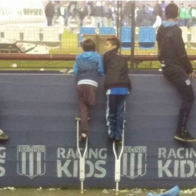 Imagem comovente flagra menino sem perna emprestando muleta para amigo conseguir assistir jogo de futebol