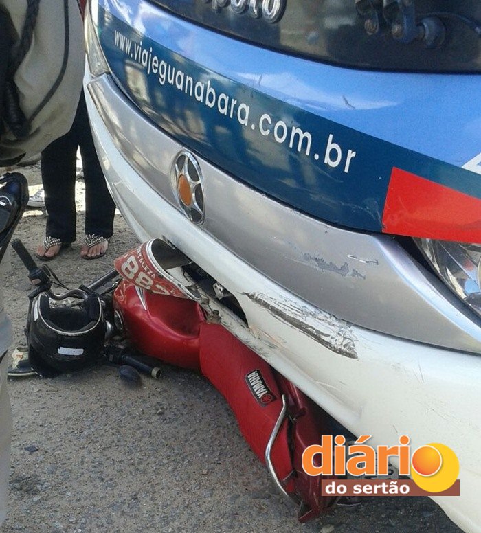 Com o impacto, a motocicleta ficou embaixo do ônibus e o condutor sofreu fratura exposta no braço direito e suspeita de fratura na perna direita